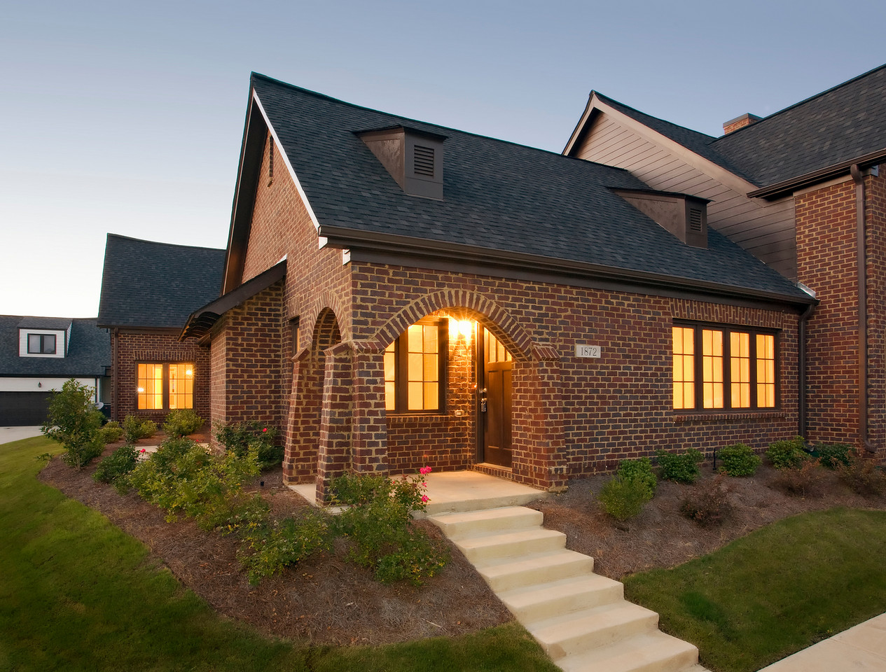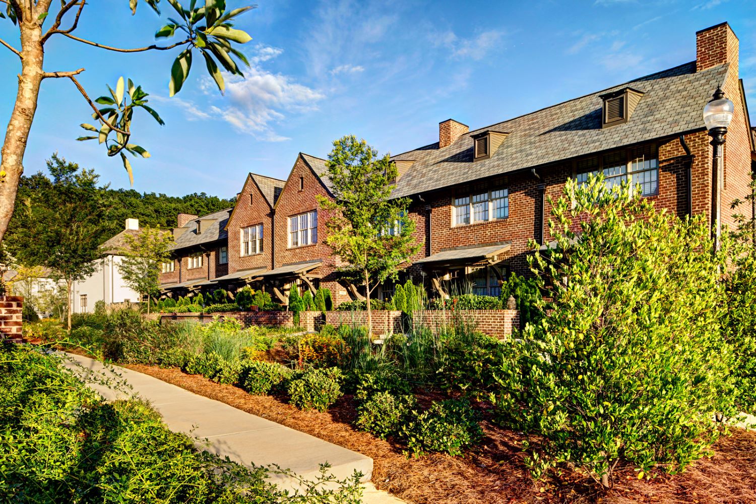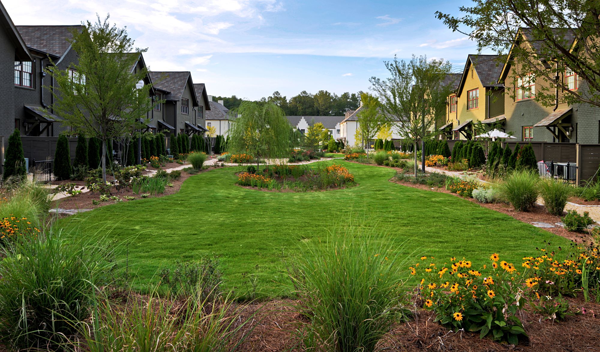 The solution, Edenton Townhomes, maintained the original English village feel with 16-foot-wide row homes. Buyers could choose between open loft-like layouts or main-level bedrooms, with three upper-level configurations. Each unit was fronted with a simple porch to promote interaction and community. All residences face streets or greens. Rain gardens occupy remaining open space and assist with storm water management.