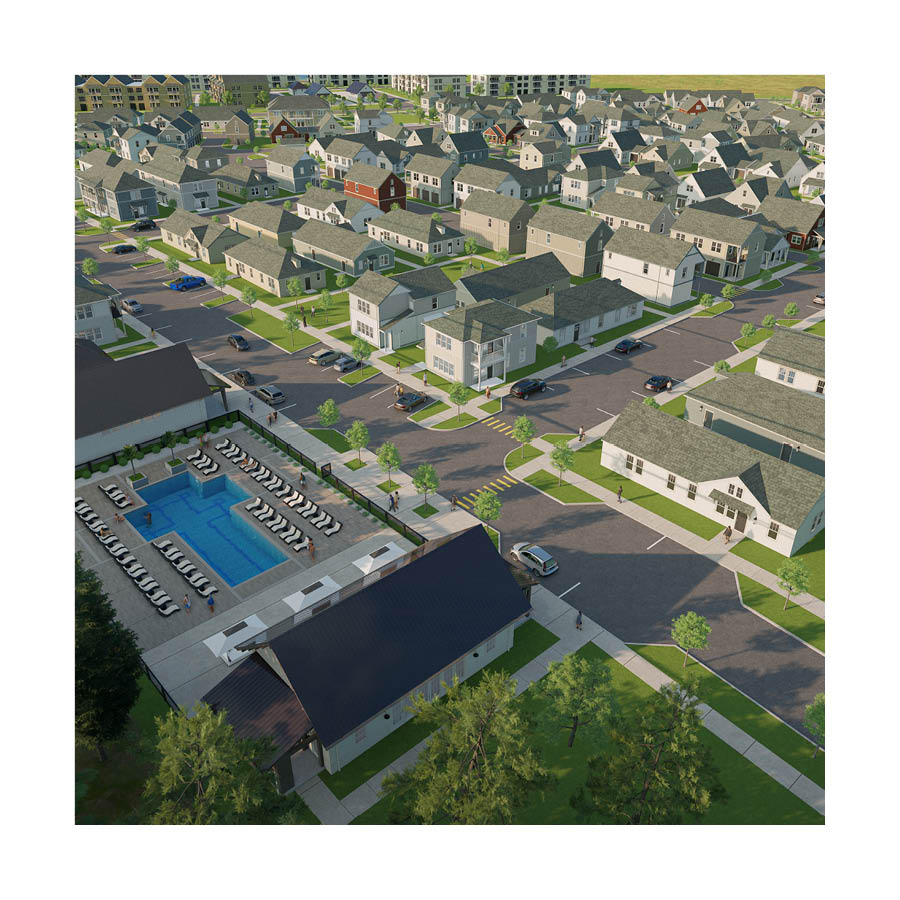 The proposal still allows for the advanced manufacturing training center, and now we are surrounding that with a mix of housing options, from overnight stay (hospitality) to long-term rental to fee simple home ownership. The variety of retail, restaurant, and commercial office opportunities will help make this area a thriving LIVE-WORK-PLAY district and offer onsite residents and nearby property owners a different living experience than is currently offered in Daphne. The planning aims to infill the wide boulevard streets with on-street parking broken by street tree wells to create an inviting pedestrian zone where residents and visitors can enjoy the community greens, parks, and walking paths that weave through and around the site.